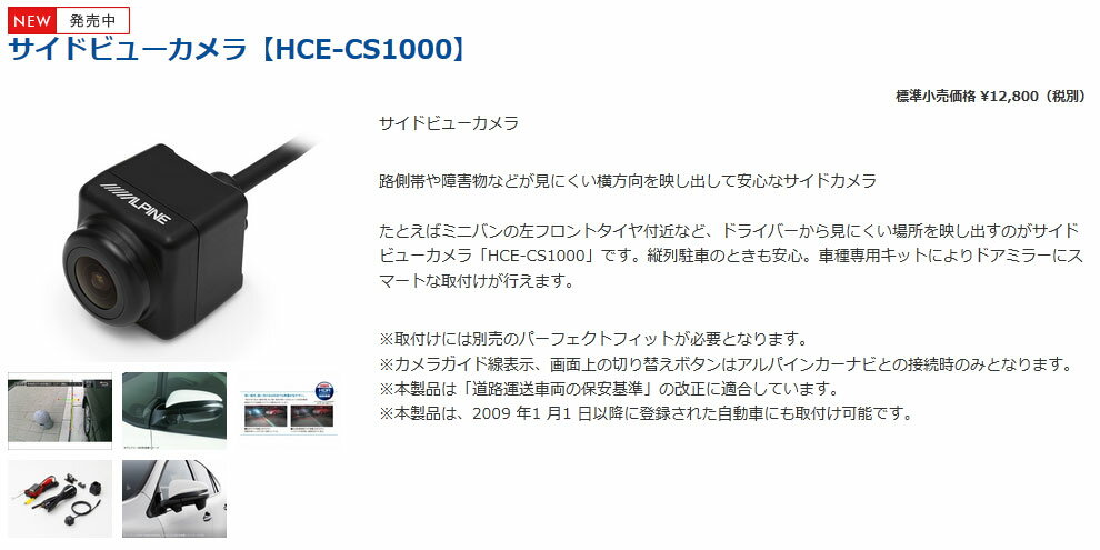種類 HDRサイドビューカメラ+車種専用取付キットセット 商品名 メーカー ALPINE 型番 HCE-CS1000+KTX-Y005HI 最新のHDRサイドビューカメラにハイエース・レジアスエース専用取付金具を加えた買い得なセット商品です! HCE-CS1000 非常に見えづらい左サイドの死角を、HDDカーナビ画面で確認できる「サイドビューカメラ」 ■先進のデジタル技術で、鮮明映像を実現。