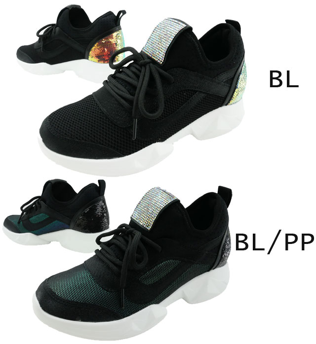 ■商品説明 レディース インヒール スニーカー スリッポン BL(ブラック)BL/PP(ブラック/パープル)バックスタイルはスパンコール、前から見たらギッシリのラインストーン!アッパーにもさり気ないキラキラ素材!360℃どこから見てもキラキラと輝くスニーカーです。