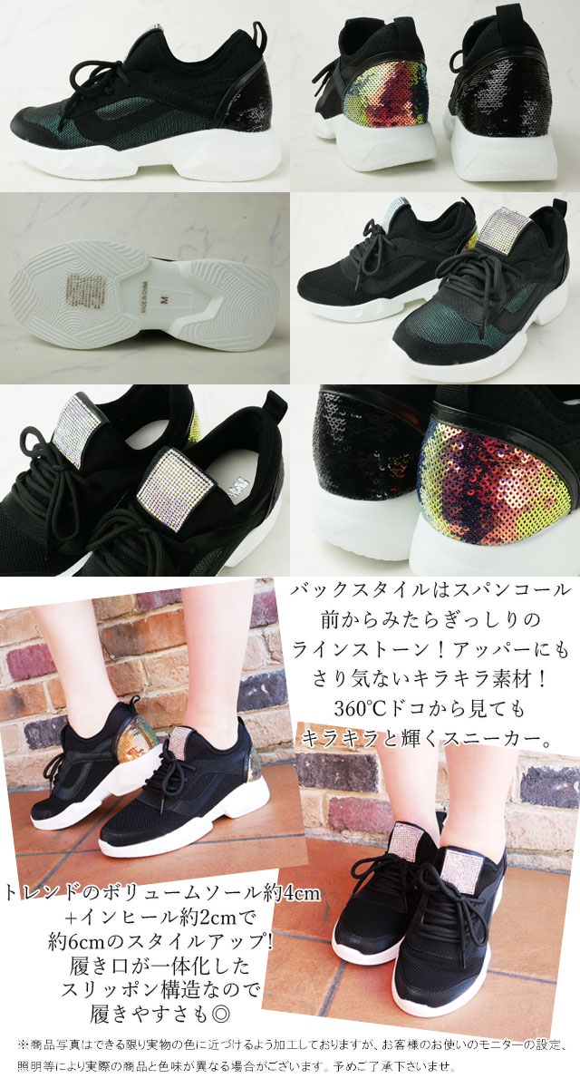 【送料無料】レディース インヒール スニーカー スリッポン ローカット ボリュームソール スパンコール ビジュー キラキラ 厚底 軽量 靴 504 ブラック 黒 テレワーク 在宅勤務