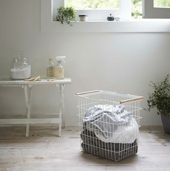 ■整列したスチールの線材とやさしい表情の木との組み合わせが美しいランドリーバスケット。